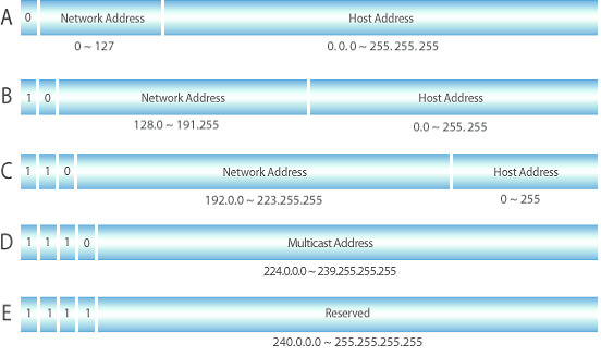 IPv4주소는 네트워크의 크기나 호스트의 수에 따라 A, B, C, D, E 클래스로 나누어집니다. A, B, C 클래스는 일반 사용자에게 부여하는 네트워크 구성용, D 클래스는 멀티캐스트용, E 클래스는 향후 사용을 위하여 예약된 주소입니다.