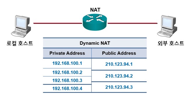 외부 IP주소를 Pool로 만들어 놓고, 그 중에서 사용하지 않는 IP를 동적으로 Mapping 시킨다. 이 방식은 외부 IP의 수가 내부 IP의 수보다 적을 경우 사용한다.